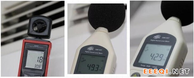 低档模式下,A品牌风速1.5m/s,出风口噪音48.4dB,生活区噪音42.6dB