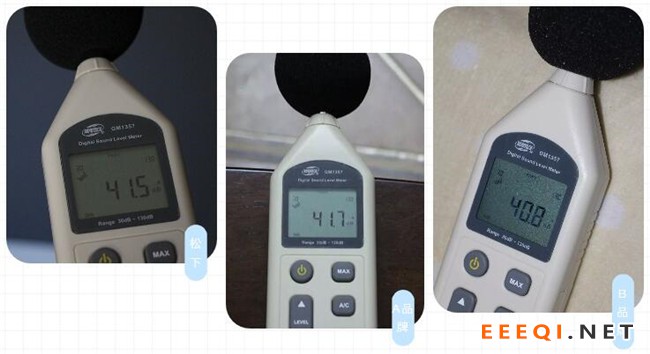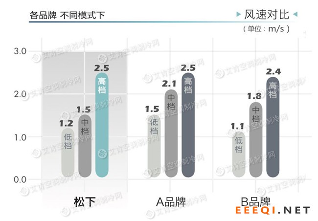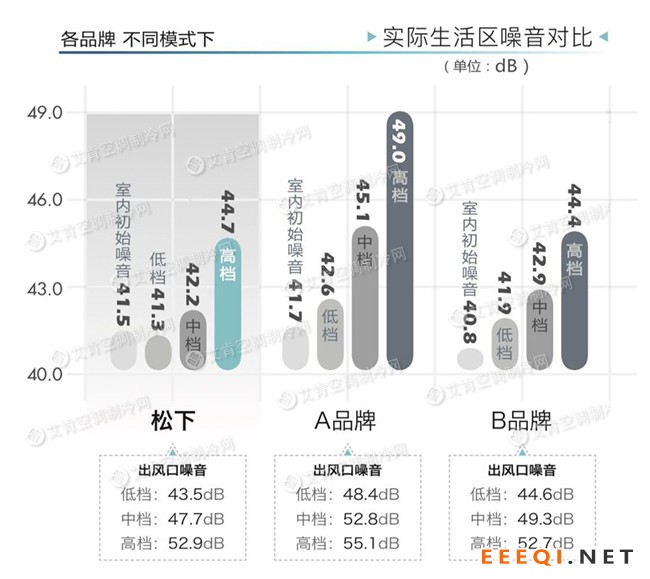 中档模式下,A品牌风速2.1m/s,出风口噪音52.8dB,生活区噪音45.1dB