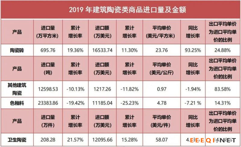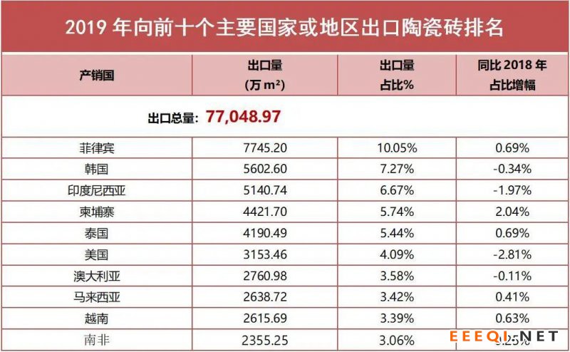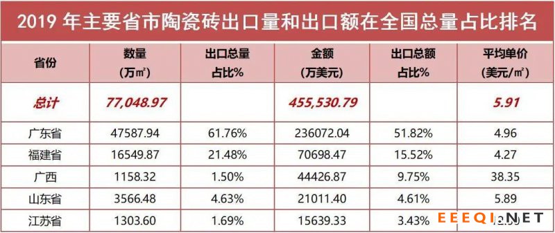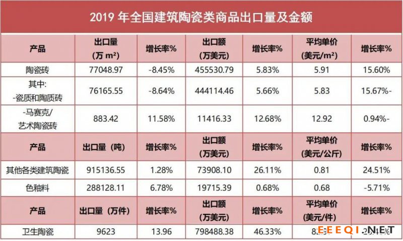 2019出口瓷砖7.7亿㎡,出口单价提高5.55元/㎡