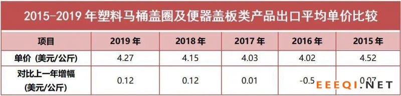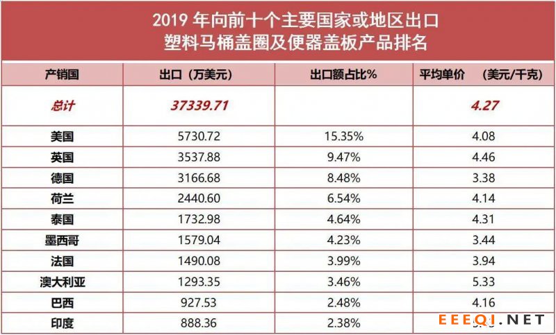 (四) 2019年全国出口塑料马桶盖圈及便器盖板类产品8.74万吨,同比增长-0.48%,出口额为3.73亿美元,同比增长2.46%,平均单价为4.27美元/公斤,比2018年提高12美分, 同比增长2.96%。超过六成的塑料马桶盖圈及便器盖板类产品出口到欧美等发达国家,前十个主要出口流向国家或地区占出口额的61.03%。