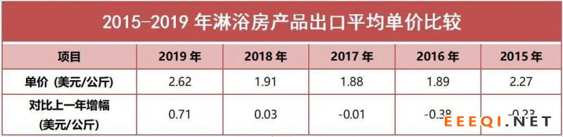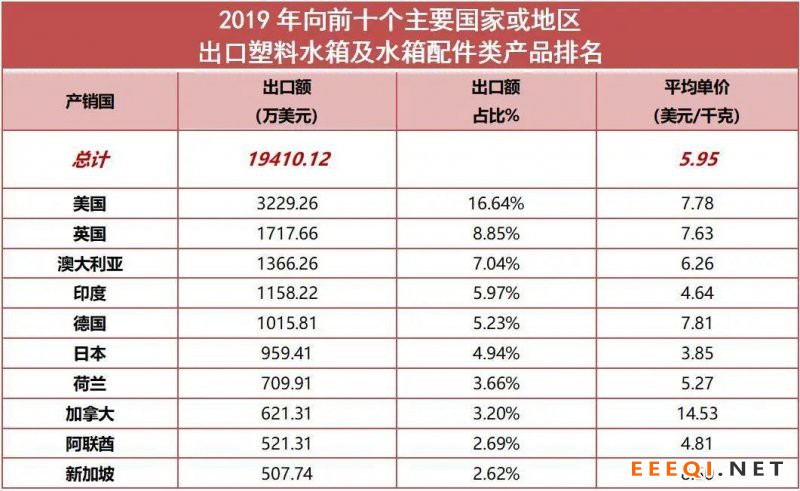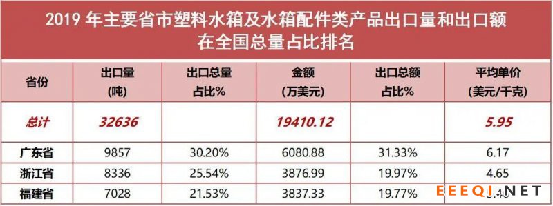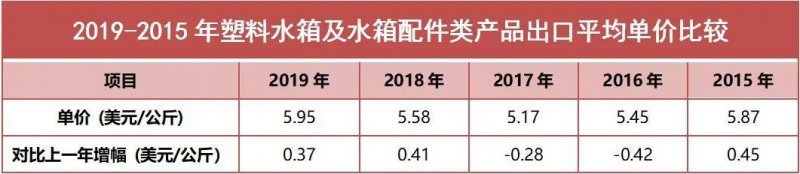(五) 2019年塑料水箱及水箱配件类产品出口继续2018年恢复性增长态势, 出口量为3.26万吨,同比增长4.28%,出口额为1.94亿美元,同比增长11.22%,平均单价为5.95 美元/公斤,同比上涨了0.37美元,增长率为6.65%。