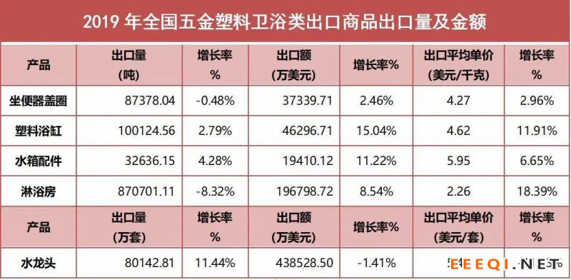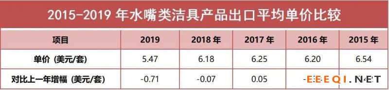 (一) 2019年,水嘴(水龙头)类洁具产品的出口量为8.01亿套,同比增长11.44%,出口额为43.85亿美元,同比增长-1.41%。