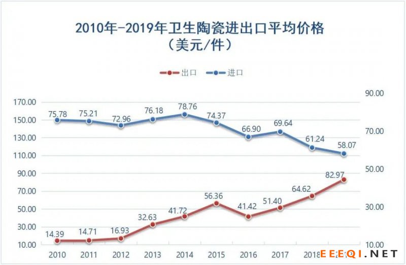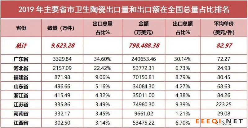 (二) 2019年,我国卫生陶瓷产品出口逆势上扬, 出口量达9623万件,同比增长13.96%, 卫生陶瓷出口量占全国总产量的40.58%; 出口总额为79.85亿美元;同比增长46.33%;平均单价从64.62美元/件上涨到82.97美元/件,同比增长28.40%;出口量、出口额及出口单价均有较大提升,并创历史新高。中国卫生陶瓷出口依旧保持占全球贸易量三分之一以上的市场份额。