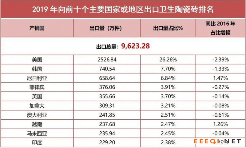 回顾2019年,在国内外复杂多变因素的影响下,我国建筑陶瓷与卫生洁具产品对外贸易经历了前所未有的挑战,中国出口陶瓷砖仍旧占据国际市场贸易量的半壁江山,洁具产品持续占据全球贸易量的40%以上市场份额,出口产品主要流向国家或地区及所占份额依旧保持稳定。