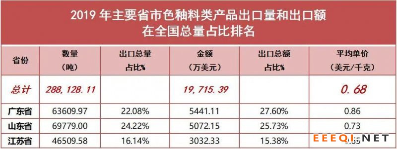 广东、山东、江苏等地区陶瓷色釉料产品出口总额占全国总量的68.71%,其中,广东出口额和平均单价均跃居榜首;尽管山东出口量仍然保持第一的位置、但其出口额和出口平均单价均低于广东省;江苏省出口量和出口额排名位列第三,其出口平均价格为0.65美元/千克, 低于行业平均水平。