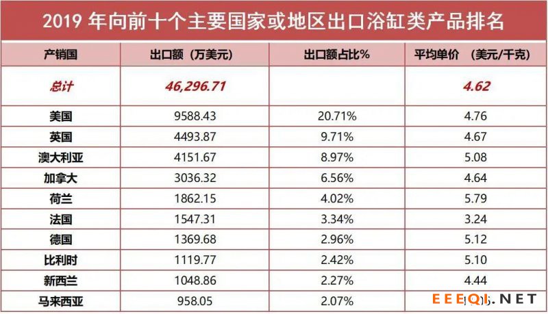 (二) 2019年全国出口浴缸类产品10.01万吨,同比增长2.79%,出口额4.63亿美元,同比增长15.04%, 出口欧美等发达国家或地区比重超过七成,向前十个主要国家(或地区)的出口占总额的63.02%。