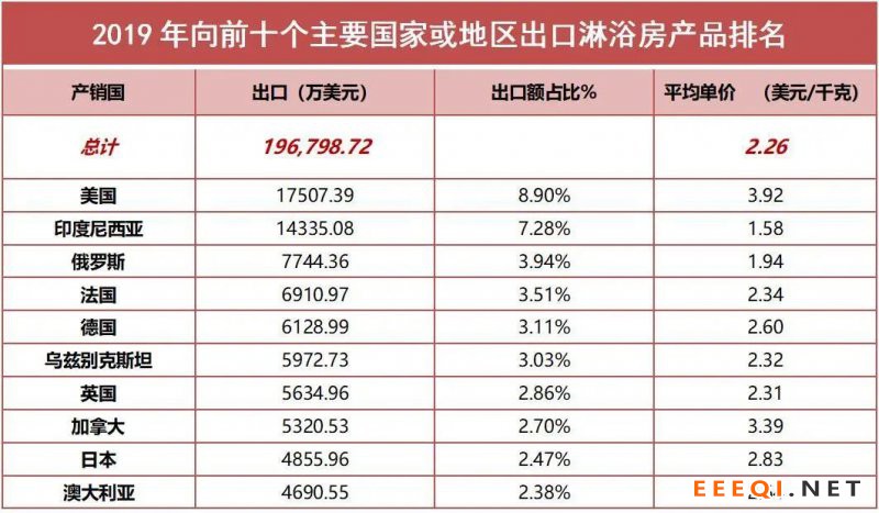 (三) 2019年全国出口淋浴房87.07万吨,同比增长-8.32%,出口额为19.68亿美元,同比增长8.54%。出口欧美等发达国家或地区的比重为三成,出口亚洲国家或地区的比重较2018年基本持平,出口量占比为41.02%。向前十个主要国家或地区的出口占总额的40.19%。