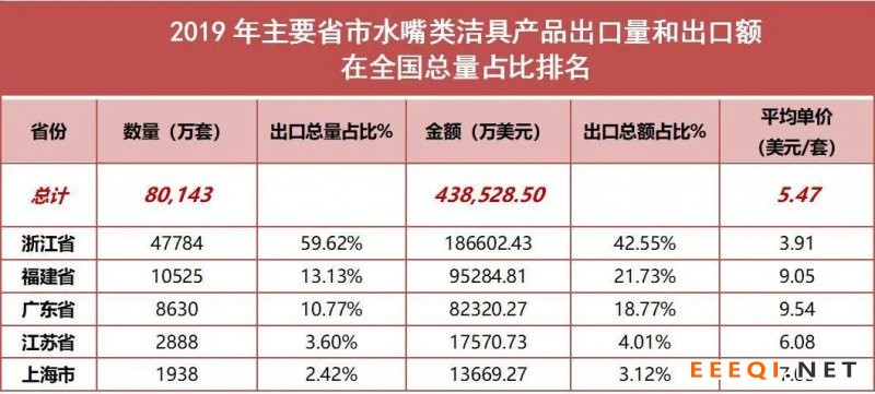 浙江、福建和广东三个地区是我国水嘴等五金洁具的主要产区,其中浙江省中小型企业数量最多,出口量和出口额均依旧占据市场领导者的地位,出口量占全国出口总量的59.62%, 出口额占全国出口总额的42.55%,但其出口平均价格低于全国平均单价,仅为平均单价的71.37%。