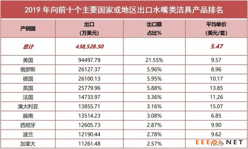 中国出口到欧美等发达国家或地区的水嘴类洁具产品约占出口量的40%,但所占金额比重超过60%。向前十个主要国家(或地区)的出口占总额的57.16%。