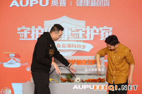 现场,杨迪还和吴兴杰一起做了水火双防墙的实验。所谓“水火双防墙”,指的是奥普家居的浴霸防水又防火,浴霸本身用在潮湿的浴室中,水导电,带来短路风险,所以防水、防火必须要做好。