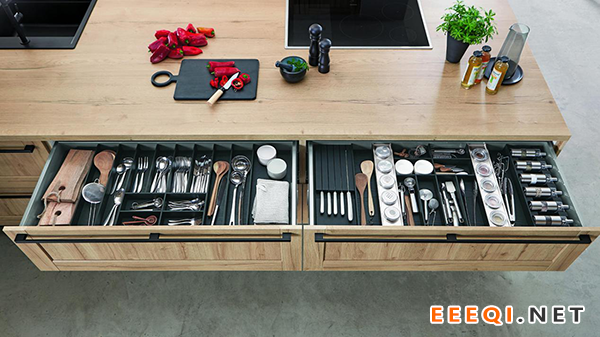 再比如我们这些抽屉内部的小分割系统,它能让我们杂乱无章的抽屉内部瞬间变得井然有序,取拿物品一目了然。