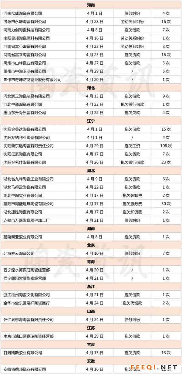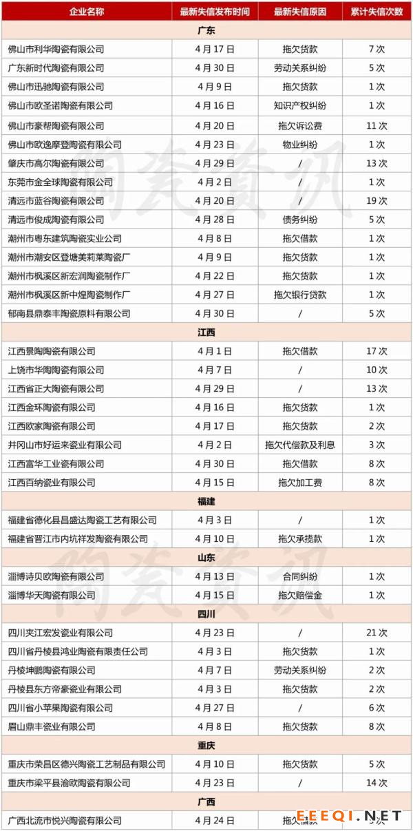 5月2日,陶卫网记者根据最高人民法院及各地法院发布的失信被执行人信息统计,2020年4月全国各地有60余家陶瓷企业被列入“失信被执行人”名单,名单涉及广东、江西、福建、山东、四川、重庆、广西、安徽、江苏、浙江、河北、河南、辽宁、山西、青海、甘肃、北京、湖北、湖南19个省(市)。此次名单中,广东省的失信陶企最多,有15家。