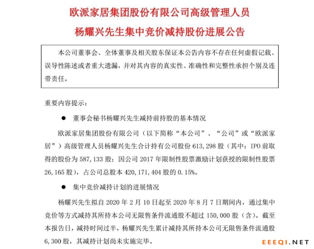 根据公告显示,欧派家居称公司高级管理人员杨耀兴自2020年2月10日起至2020年8月7日期间内,通过集中竞价等方式减持其持有欧派家居无限售条件流通股不超过150000股(含)。