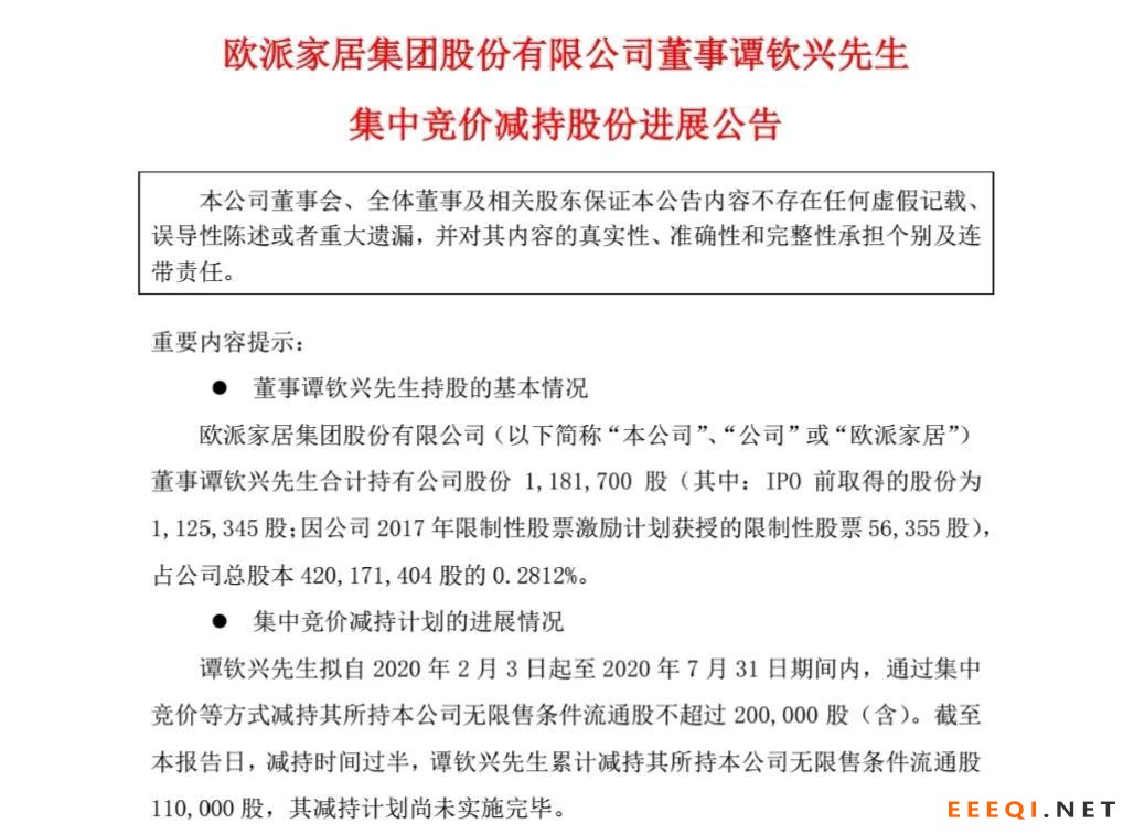 2020年5月7日,欧派家居发布《欧派家居集团股份有限公司董事谭钦兴先生集中竞价减持股份进展公告》显示,欧派家居董事谭钦兴拟自2020年2月3日起至2020年7月31日期内,通过集中竞价等方式减持其所持公司无限售条件流通股不超过200000股。截至本报告日,减持时间过半,谭钦兴累计减持其所持本公司无限售条件流通股110000股,其减持计划尚未实施完毕。