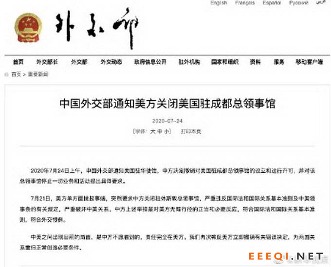 2020年7月24日上午,中国外交部通知美国驻华使馆,中方决定撤销对美国驻成都总领事馆的设立和运行许可,并对该总领事馆停止一切业务和活动提出具体要求。
