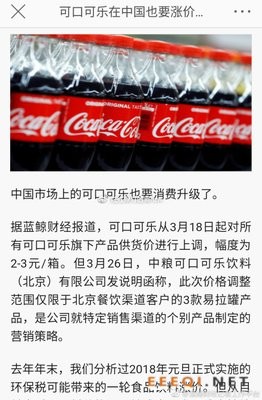 据美国消费者新闻和商业频道(CNBC)报道,可口可乐公司CEO詹姆斯•昆西19日表示,由于原材料价格上涨,该公司打算提高产品售价。